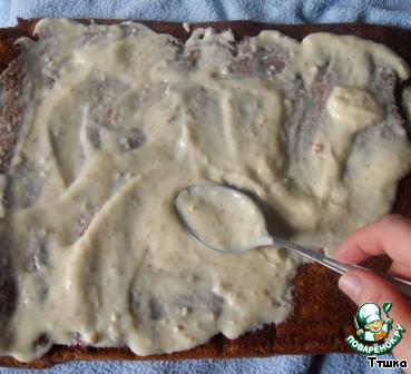 Сворачиваем и обмазываем сверху. Я рулет обсыпала миндалем.