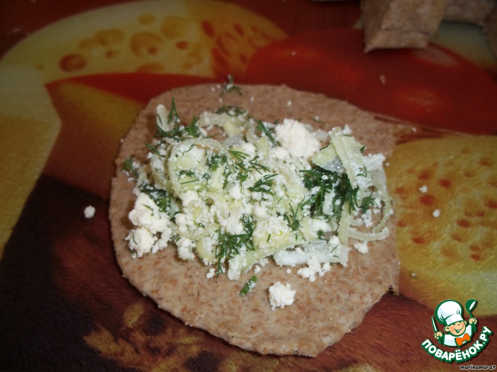 Делаем начинку: мелко режем лук-порей (можете заменить на зеленый лук или, на крайний случай, взять сухой лук). Здесь именно лук-порей дает особый аромат и вкус (не знаю как с другим будет); добавляем мелко нарезанный укроп, творог (солим, если творог пресный); перчим, добавляем приправки по вкусу (у меня - имбирь), и все хорошо перемешиваем.