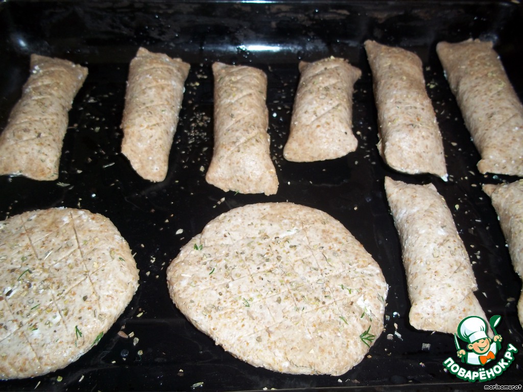 Туго заворачиваем рулетиком, защипываем края. Когда все рулетики готовы (я кстати еще и лепешечки сделала для разнообразия), кладем их на смазанный маслом противень, делаем надрезы, при помощи кисточки смачиваем тесто водой (для того, чтобы корочка получилась красивой и хрустящей). Посыпаем щедро орегано!