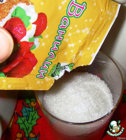 Ванилин всыпаем в сахар, перемешиваем и, продолжая взбивать яйца, потихоньку всыпаем сахар. Взбиваем еще 3-5 минут.