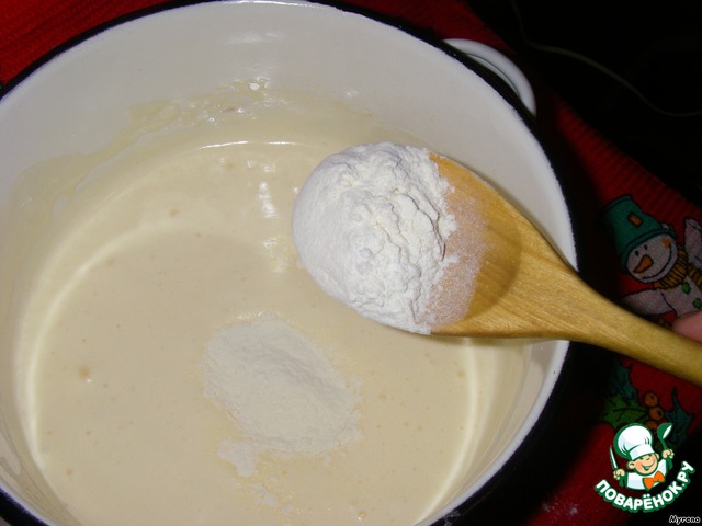 Дальше миксер откладываем. В муку добавляем разрыхлитель и потихоньку вводим муку к яйцам, аккуратно перемешивая ложечкой. Чтобы не нарушить воздушную структуру яично-сахарной массы