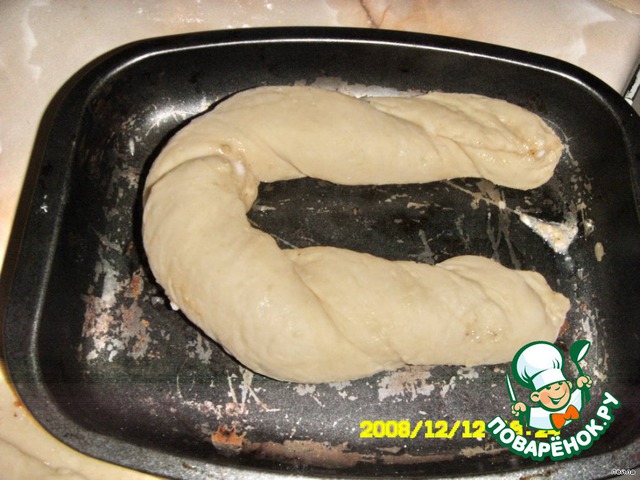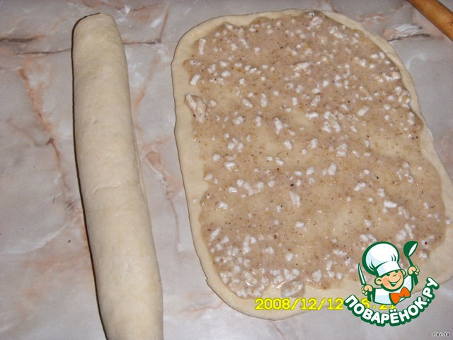 Когда тесто подойдёт,его раскатать 50 на 40 см и смазать начинкой. Свернуть рулет по длинной стороне.Это всё хорошо перемешать. Затем разрезать в длину пополам и скрутить жгут косу.Я сделала по отдельности 2 листа,смазала начинку,и свернула жгутом.