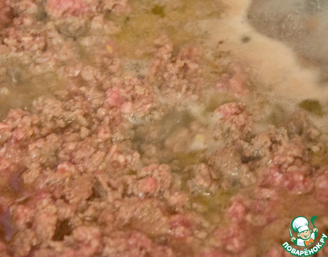 Фарш обжарить в сковороде с небольшим количеством воды. Посолить, поперчить.
