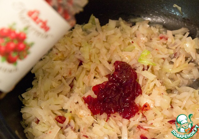 За 3 минуты до готовности капусты добавить 5 чайных ложек клюквенного соуса.