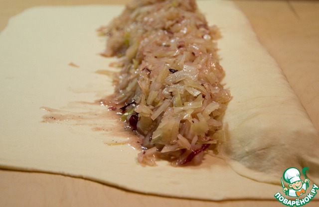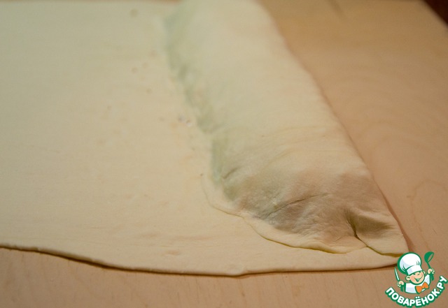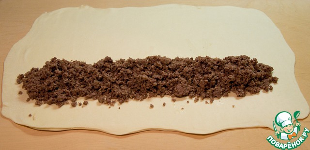 Слоеное тесто раскатать тонким слоем. Выложить фарш вдоль теста, оставляя от края 7—8 см.