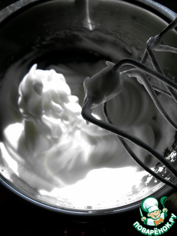 Яйца разделить на желтки и белки. Белки взбить в крепкую пену и добавлять постепенно сахар.