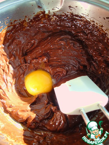 Для начинки растопить шоколад на водяной бане. Взбить с мягким маслом. Затем добавлять по одному яйцу и хорошо перемешивать.