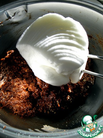 Добавить миндаль и белки в шоколадную массу и осторожно все хорошо перемешать.