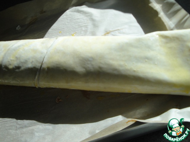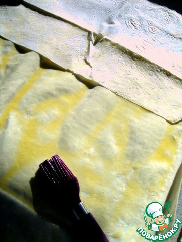 Тесто (размером примерно 30Х40) промазать растопленным сливочным маслом. Внахлёст уложить следующий кусочек и также его промазать. Затем так же поступить и с последним.