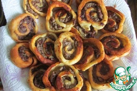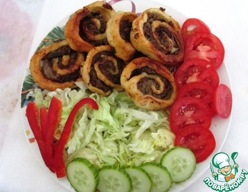 | Очень вкусная выпечка! Все знают беляши? А вот завитуши - родственники беляшей. Интересное тесто на твороге, вкусная начинка из сырого мясного фарша и грибов с луком. Полноценный ужин или легкий обед, прекрасная горячая закуска, с пылу-жару - просто пальчики оближешь! Готовить просто и легко. Идея из старого журнала "Вкусно и просто". |