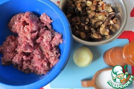 Займемся начинкой. Грибы можно взять любые: свежие, замороженные или горсть сухих. Фарш тоже можно использовать любой мясной или птичий. У меня фарш говяжий, а грибы лесные замороженные.