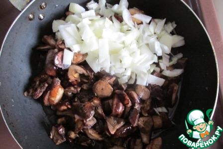 Грибы вместе с одной луковицей и солью жарим на растительном масле до полного выпаривания жидкости и легкого зарумянивания, около 20 минут.