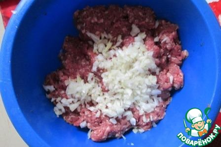 В фарш добавляем соль, перец и ещё одну луковицу, которую мелко-мелко режем. Если фарш суховат, вливаем полстакана воды. Хорошо вымешиваем.
