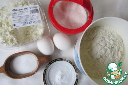 Творог, яйца, соль и сахар хорошо растираем в однородную массу без явных крупных комочков.