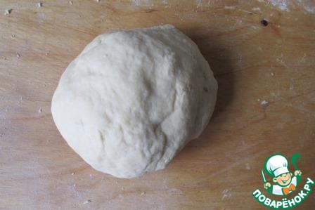 На доску высыпаем остаток муки, выкладываем тесто из миски и замешиваем плотное упругое тесто, как на пельмени.