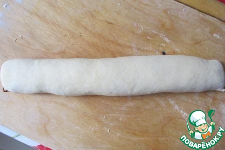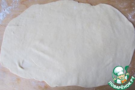 Тесто делим на 2 части. Каждую часть раскатываем в тонкий овальный пласт. Приблизительно 40х20 см.