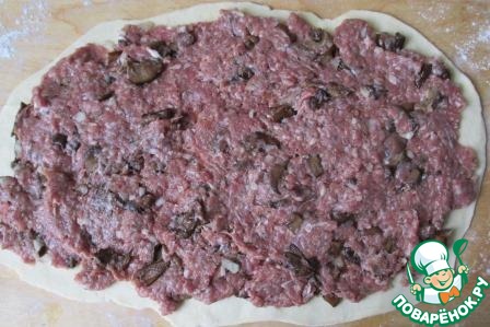 Половину начинки выкладываем на лист теста и равномерно распределяем.