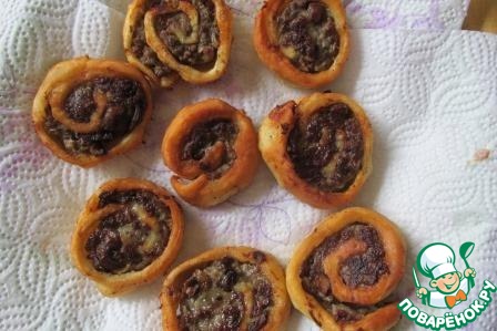 Выкладываем завитуши в горячее масло, накрываем крышкой и жарим на огне ниже среднего с двух сторон до желаемой румяности. Не стоит витуши пересушивать. Мясной фарш жарится очень быстро, а грибы у нас уже готовые, поэтому процесс жарения не пускайте на самотёк.