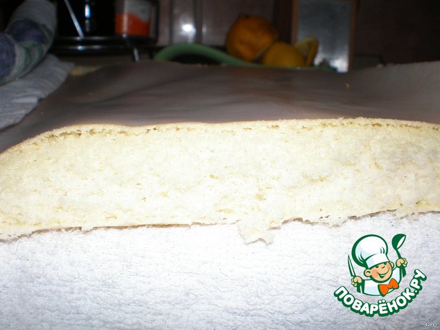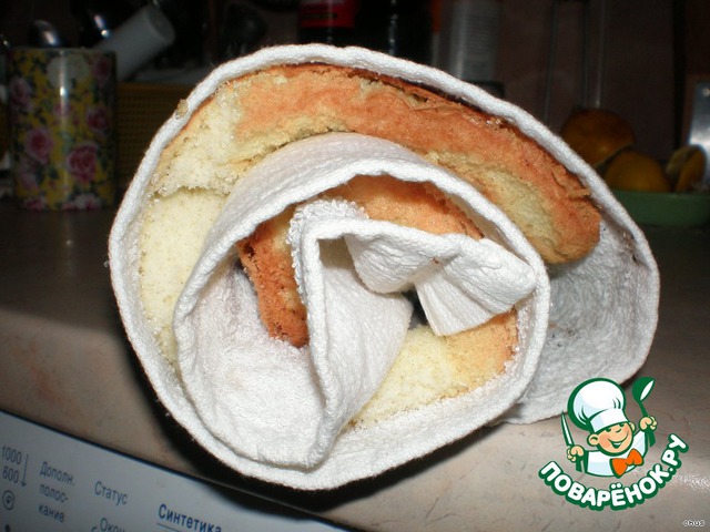 На сухое кухонное полотенце посыпать сахаром, выложить бисквит и скрутить рулетом. Дать остыть.