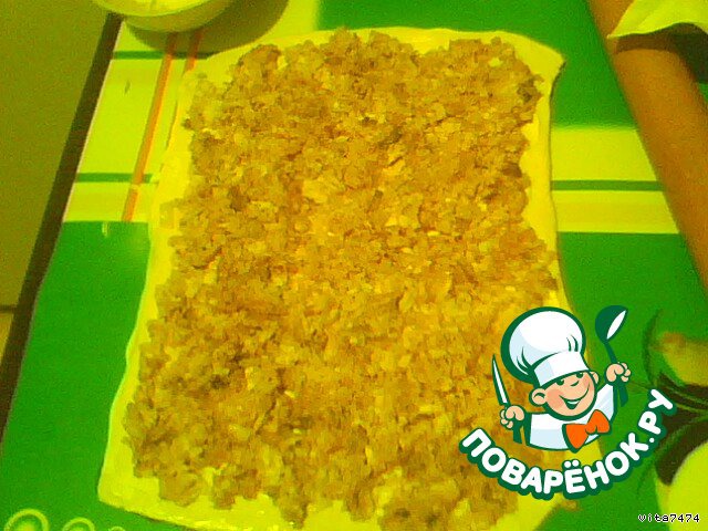Режем мелко лук, обжариваем до золотистого цвета. Отварное куриное мясо добавляем в лук и обжариваем. Взбиваем 3 яйца, вливаем в курицу с луком, приправим "Вегеттой" и, помешивая, жарим до готовности яйца. Раскатываем тесто, смазываем майонезом слегка. Выкладываем остывшую начинку, поливаем сверху немного сметаной, смешанной с соевым соусом.