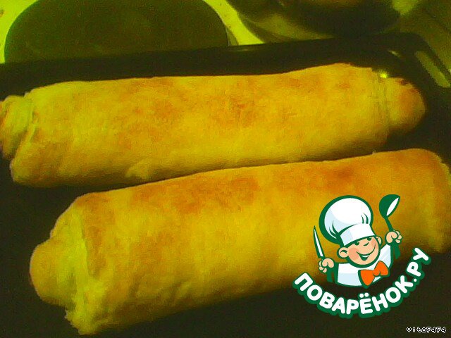 Выкладываем на противень, предварительно смазанный маслом, швом вниз. Ставим в горячую духовку. Выпекаем на среднем огне до золотистого цвета.