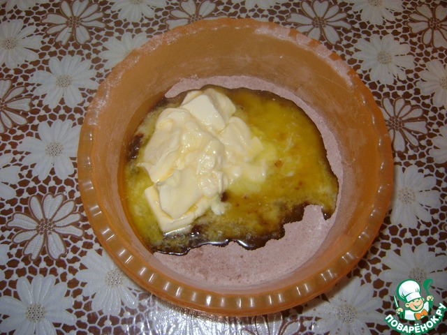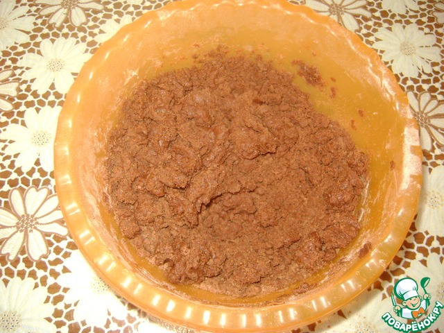 Смешать просеянные муку, какао, разрыхлитель и ванилин. Добавить размягченное сливочное масло (200гр).
