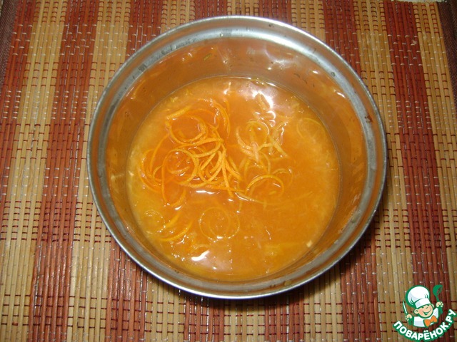 Натереть цедру цитрусовых. Выжать сок и мякоть двух апельсинов и одного лимона.