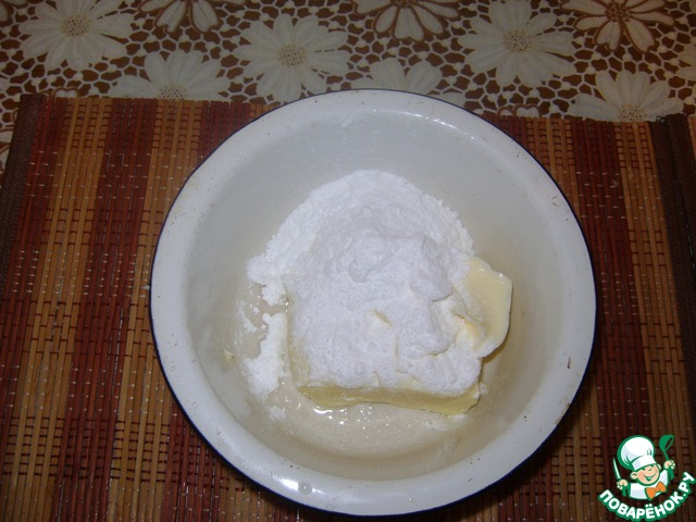 Размягченное сливочное масло (200 грмм) соединить с сахарной пудрой.