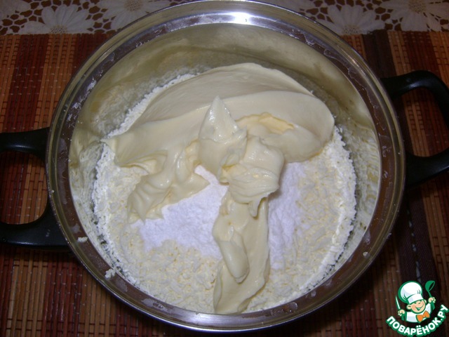 Добавить масло к творогу, добавить еще немного сахарной пудры, хорошо взбить до воздушной консистенции.