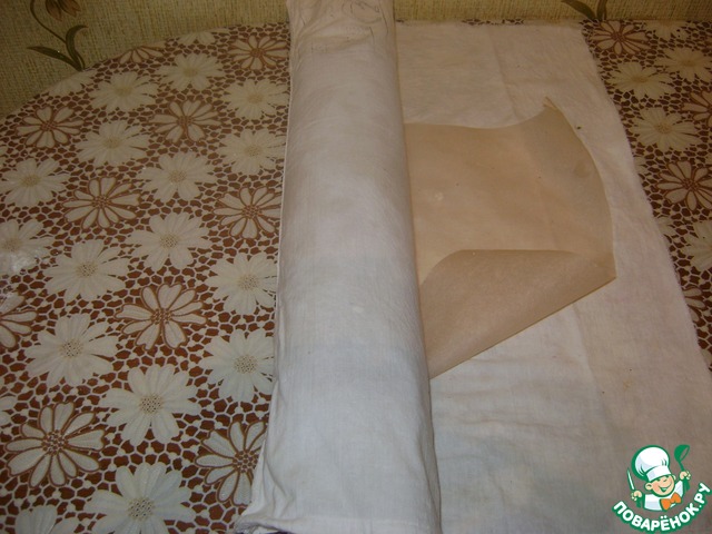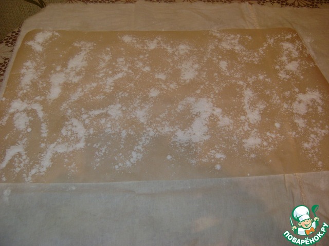 На полотенце положить лист пергаментной бумаги, присыпать сахарной пудрой.