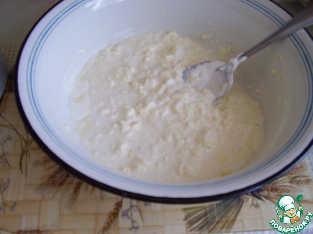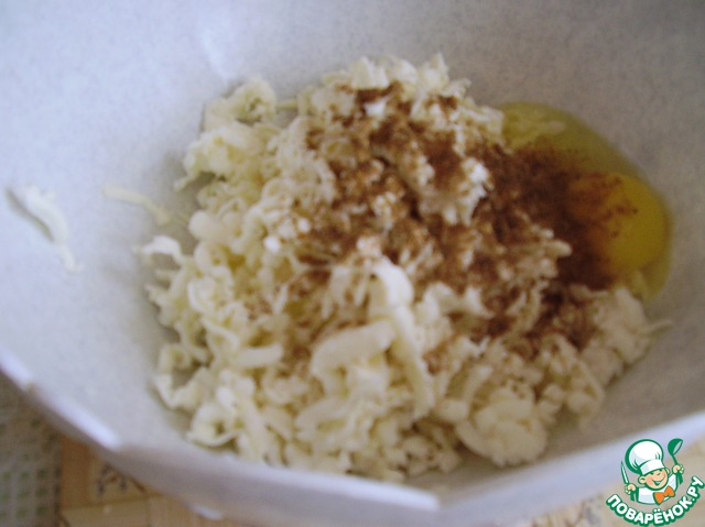 Для теста масло или маргарин натереть на терке. Одно куриное яйцо растереть с сахаром, добавить сметану и соль. Муку смешать с разрыхлителем, добавить масло, яично-сметанную смесь и замесить тесто. Долго мешать не надо. Тесто будет мягкое и пластичное.