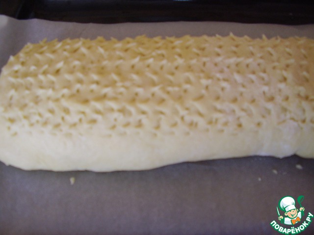 Рулет перекладываем швом вниз на выстланный бумагой противень. Можно нанести узор ножницами.