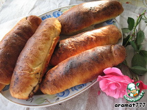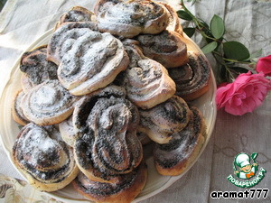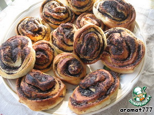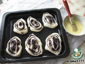 Раскатываем тесто, смазываем растительным маслом, по всей поверхности раскладываем предварительно распаренную (обязательно) начинку - мак, смешанный с сахарным песком, перетёртые блендером. Сворачиваем (закручиваем) тесто в форме рулета. Нарезаем на куски (4 см), разрезаем посередине и выворачиваем в форме плюшки. Смазываем льезоном (один желток + 50 г молока)