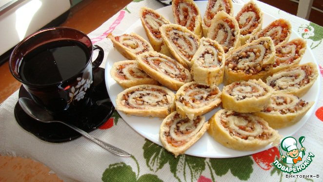 | Купила я на днях журнал "Школа кулинара", увидела рецепт "Вертуты с орехами и изюмом". Решила испечь. Всe купила, кроме изюма))) В общем, на сайте тоже есть подобные рецепты, но я объединила всe вместе! И получился рулет (если по-честному, когда начала скручивать спиральку, он начал ломаться!). Но хуже от этого не стал! Попробуйте, очень вкусно со свеже-заваренным чайком. |