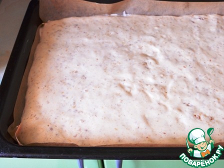 Застелить бумагой для выпечки форму. (Я использовала противень размером 36х26 см.) Слегка смазать бумагу растительным маслом. Выложить на нее начинку и равномерно распределить.