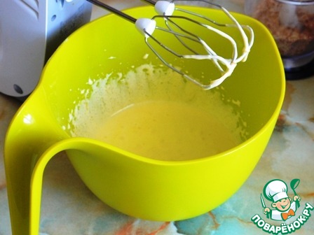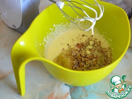 Добавляем орехи и банановое пюре к желтковой массе. Перемешиваем миксером на небольшой скорости.