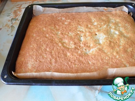 Ставим противень в заранее разогретую до 180-190 град духовку. Печется бисквит примерно 15 минут. Готовность проверяем лучинкой (зубочисткой). Но не передерживаем в духовке, чтобы не пересушить!