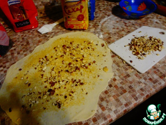 По всей поверхности распределить коричневый сахар "Мистраль" (фото не в фокусе). Орехи фундук раздавить скалкой на мраморной доске и высыпать поверх сахара.