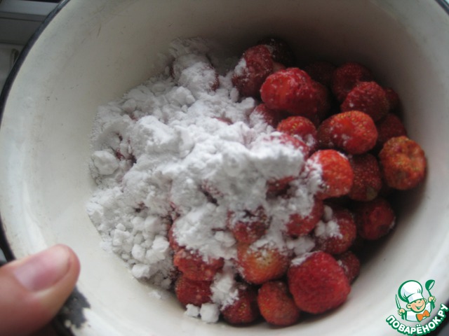 В это время готовим начинку. Клубнику очистим и перемешаем ее с крахмалом. Из моих наблюдений - я бы теперь положила клубники побольше - примерно на 100г., и сахарочка немного больше бы положила - самую малость)))