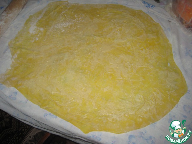 Расстелите на столе большое кухонное полотенце (я взяла тонкую детскую пеленку). Присыпьте его мукой. На полотенце раскатайте как можно тоньше тесто в прямоугольный пласт. Смажьте его растопленным сливочным маслом (используем не все масло, примерно половину)