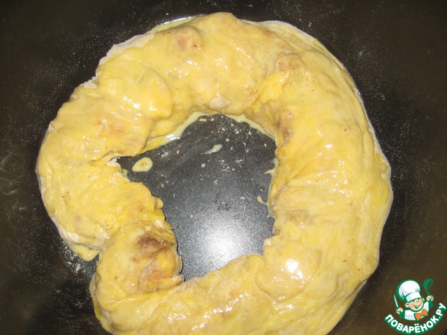 Если печете в духовке - противень смажьте маслом и посыпьте мукой. Если готовите в мультиварке, как и я, просто присыпьте чашу немного мукой. Швом вниз уложите на него ретеш. Смажьте тесто желтком с молоком и выпекайте. Если в духовке - в разогретой до 180град. С примерно 40-50 мин