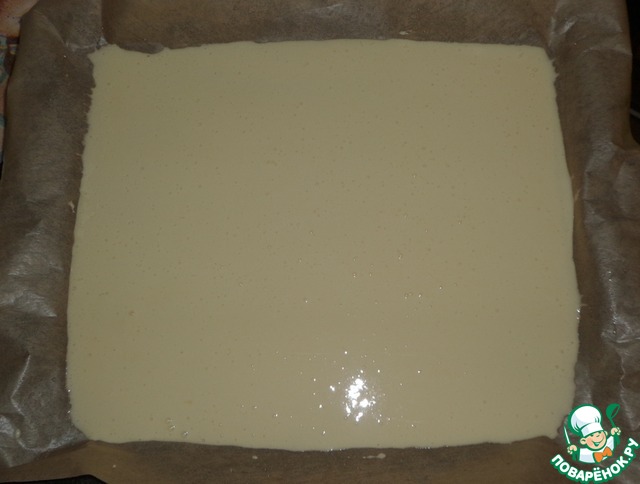 Тесто равномерно распределяем по противню (застелить бумагой для выпечки). Ставим в разогретую духовку и выпекаем при температуре 180 градусов до готовности (15-20 мин).
