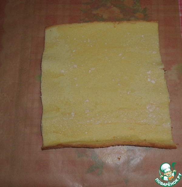 Готовый рулет сворачиваем вместе с бумагой. Даем остыть 5-10 мин и аккуратно разворачиваем.