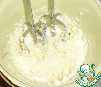 Крем приготовим следующим образом: творог растереть с сахаром, добавим мороженое кусочками и взбить хорошо миксером.