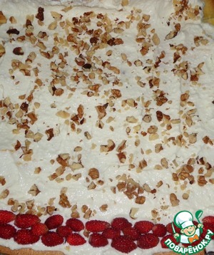Бисквит смазать кремом (оставить 1 ч. л.) и посыпать грецкими орехами. На край бисквита кладем землянику.