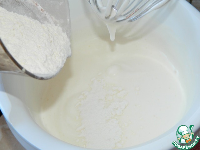 Добавить соду и аккуратно вмешать муку и крахмал.