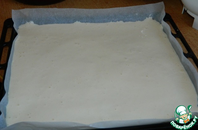 Противень застелить бумагой для выпечки, смазать маслом и распределить равномерно тесто. Выпекать при 180 С минут 7-10.