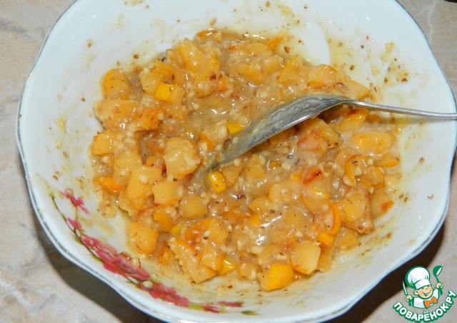 Остывшую айву смешать с молотыми грецкими орехами и сгущенкой.