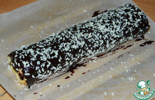 Темный шоколад растопить и соединить со сливками. Смазать рулет со всех сторон шоколадной глазурью и посыпать белым шоколадом. Убрать в холод застыть.