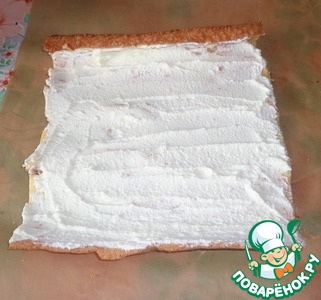 Приготовить творожный крем можно следующим образом: творог протереть через сито, взбить с сахаром, добавить мороженое и взбиваем 2 минуты. Крем немного загустеет. Покрываем бисквит.